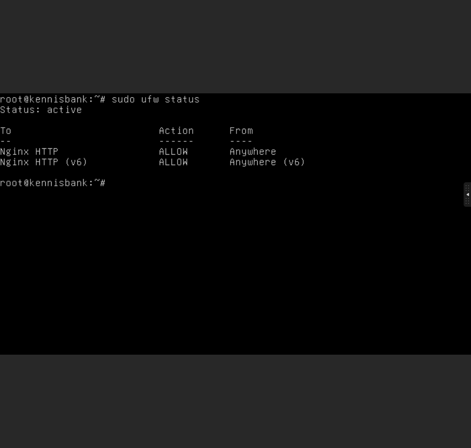 - We gaan nu de firewall openzetten. Het is aangeraden om dit alleen te doen voor de poort die je gebruikt, Voor ons gaat dit poort 80 zijn. Wij typen dus: sudo ufw allow 'Nginx HTTP'