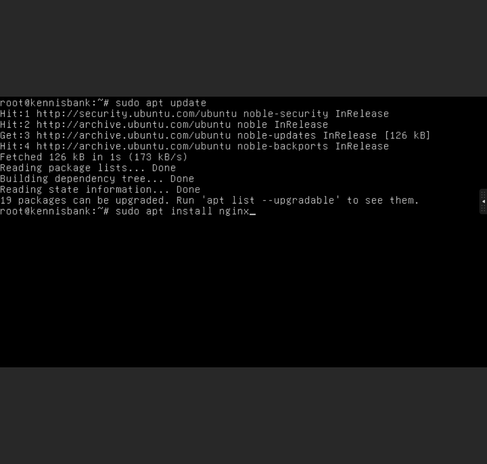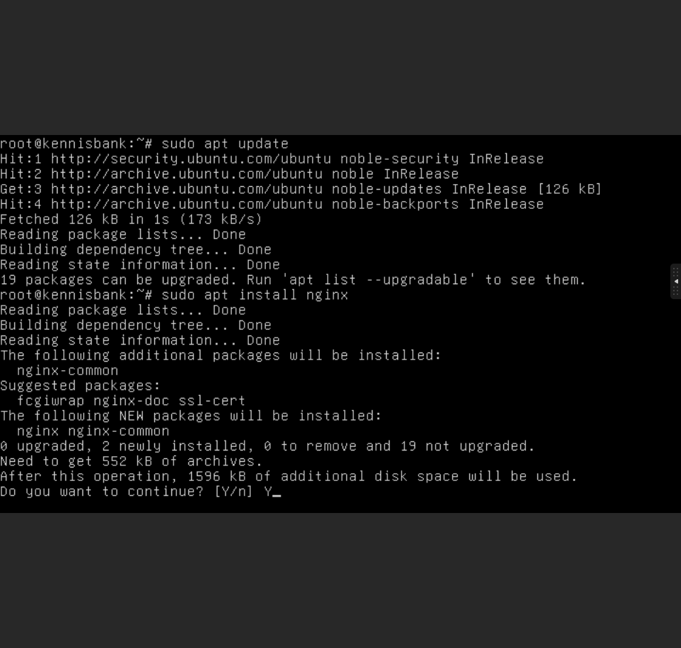 - Nu gaan we beginnen met Nginx te installeren. Doe dit door **sudo apt install nginx **te typen.