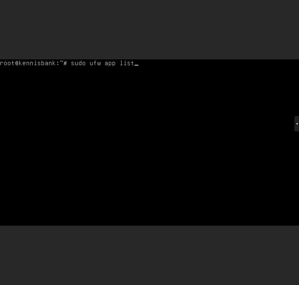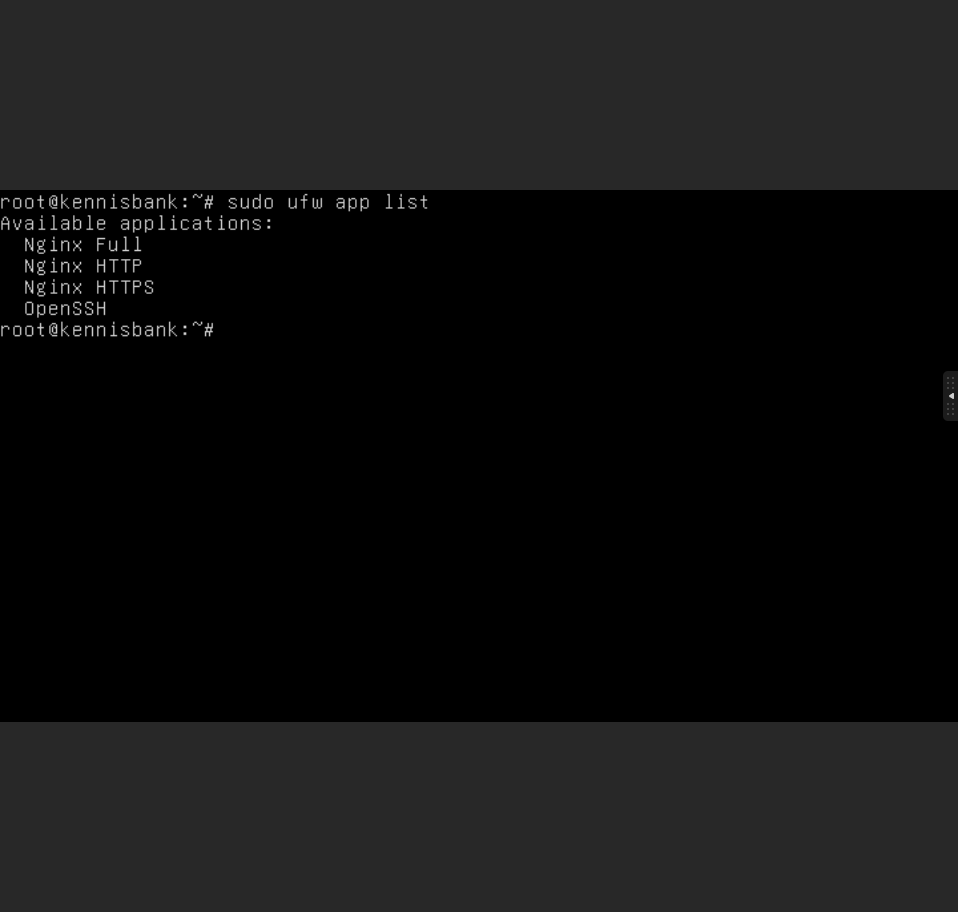 - Tijdens de installatie is Nginx al toegevoegd aan ufw. Om de lijst te krijgen van applicaties die werken met ufw, type: sudo ufw app list