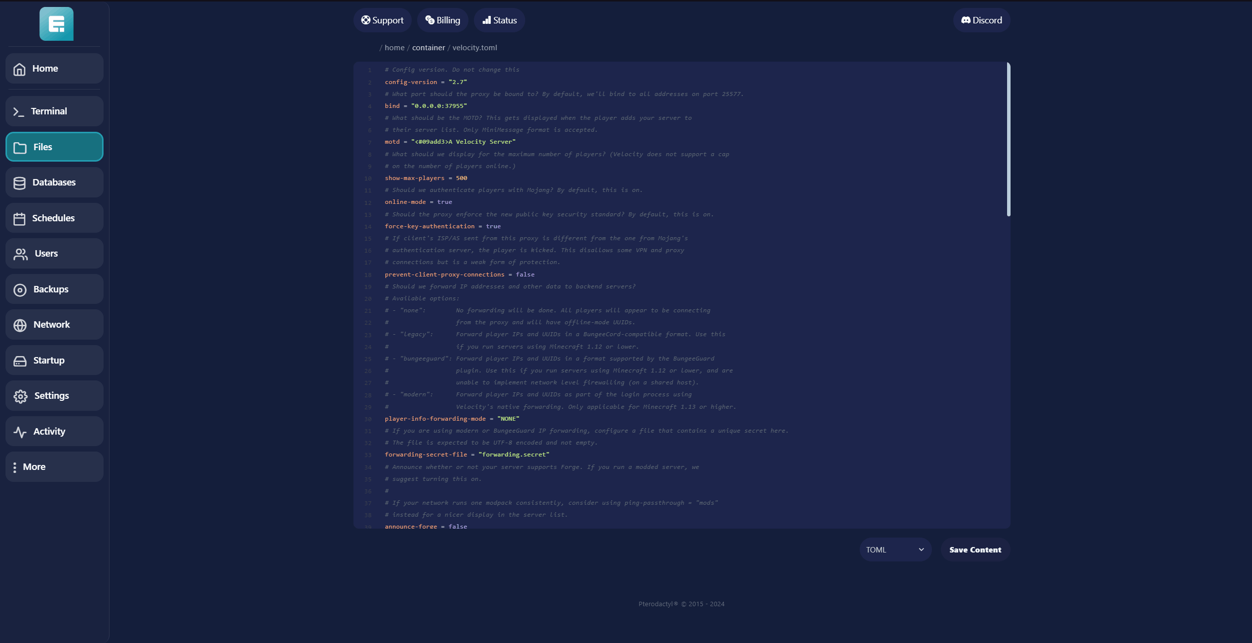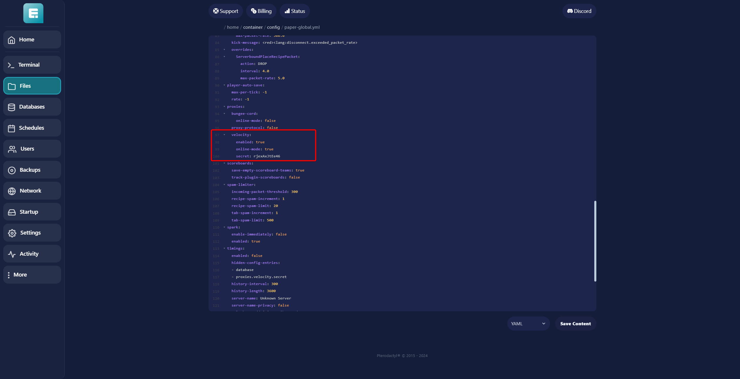 - Zet eronder bij Velocity: **enabled **op : true. En vul bij secret de code die we eerder hadden gekopieerd voor later uit het **forwarding.secret **bestand van de Bungee-server.
