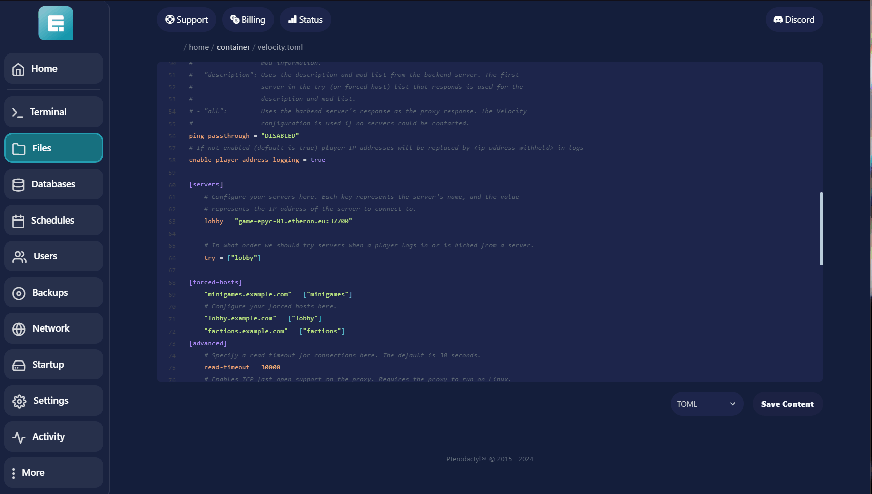 - Heb je meerdere servers? Vul die dan bij de rest in. Zo niet, verwijder de overige servers die er staan. Laat "try = ["lobby"]" wel staan! Ga dan door naar "[forced-hosts]" en verander "lobby.example.com" met het Address wat je hiervoor hebt ingevuld. Verwijder alles wat je bij de vorige stap ook hebt verwijderd of pas het aan zoals in de vorige stap! Klik hierna op Save Content.
