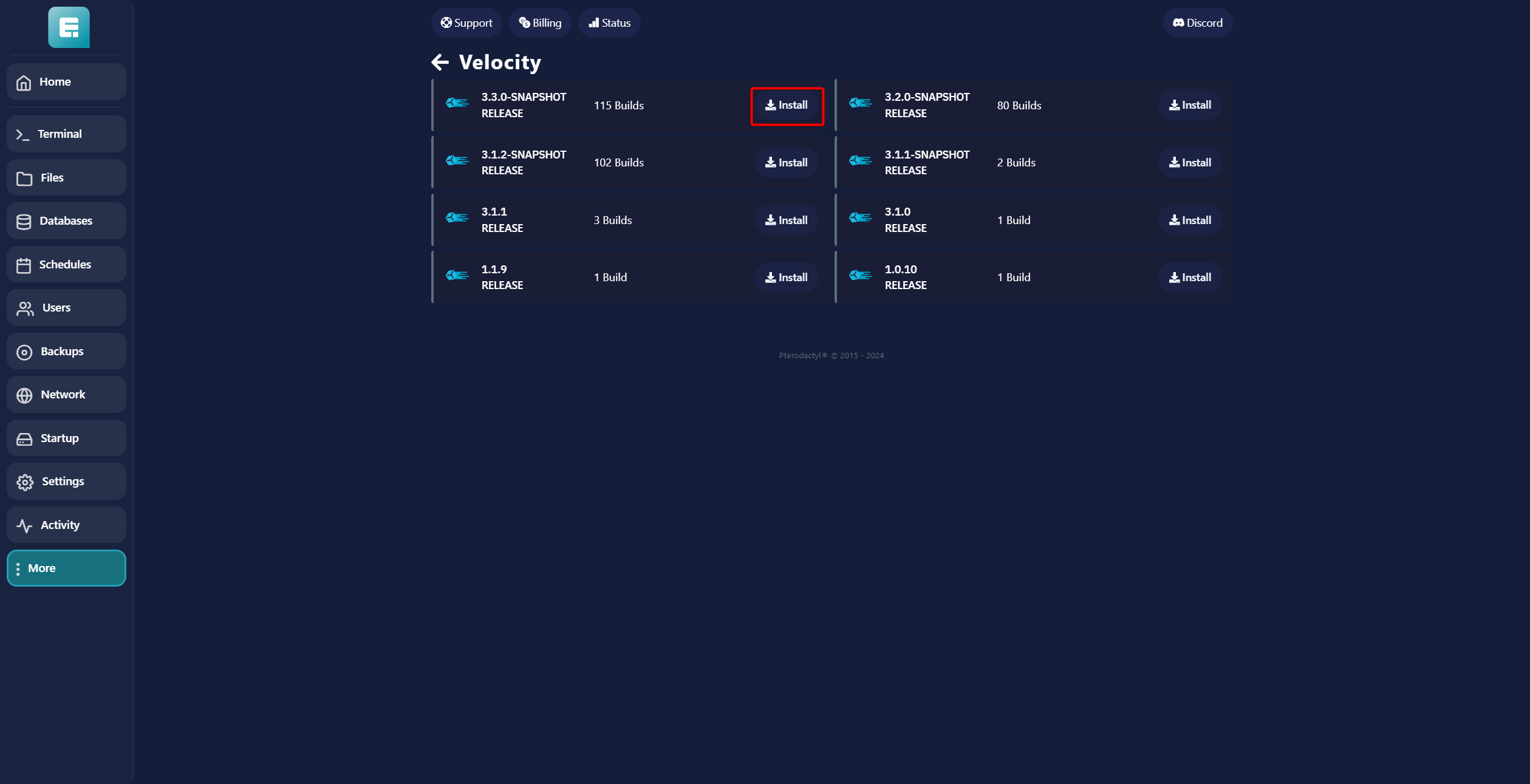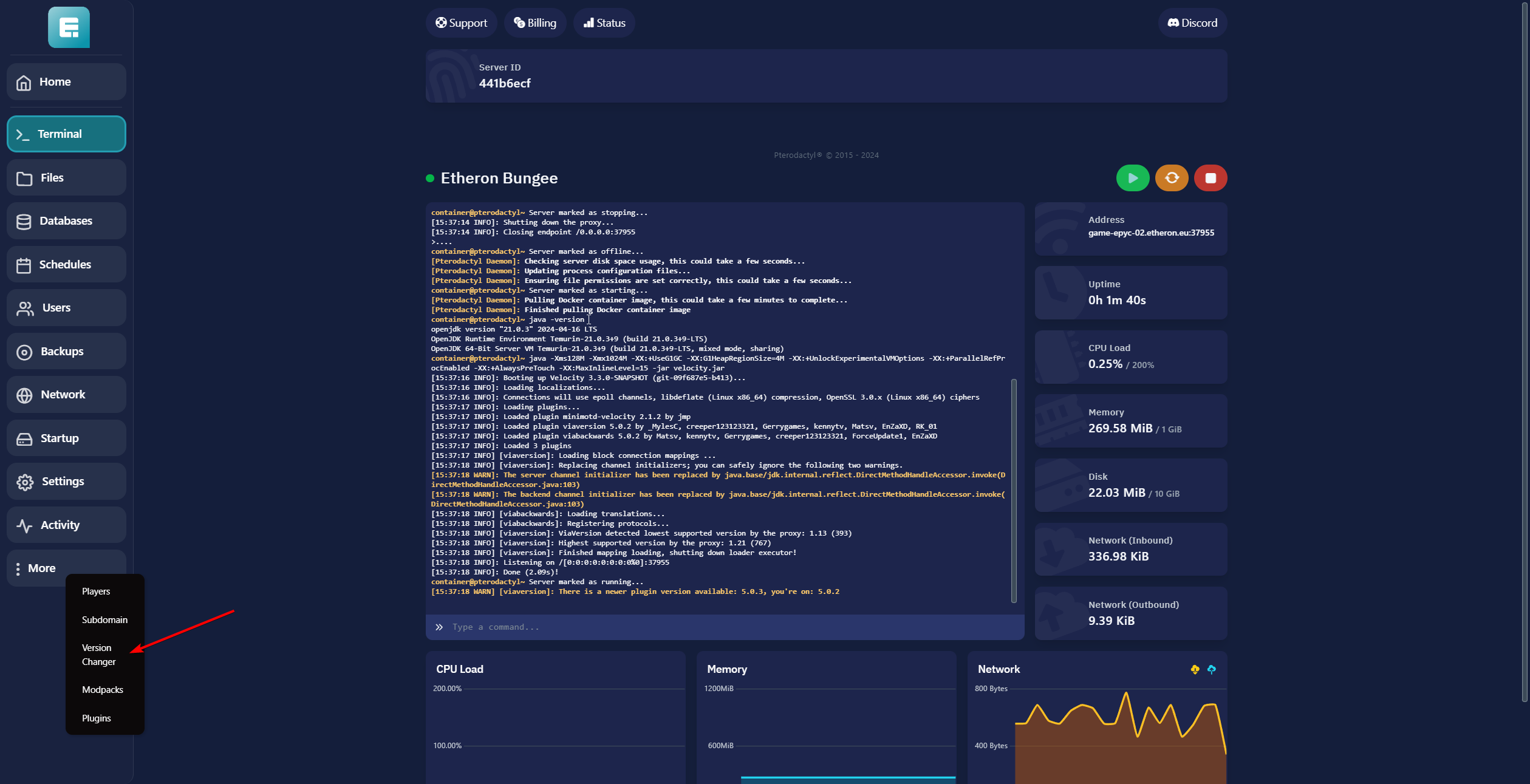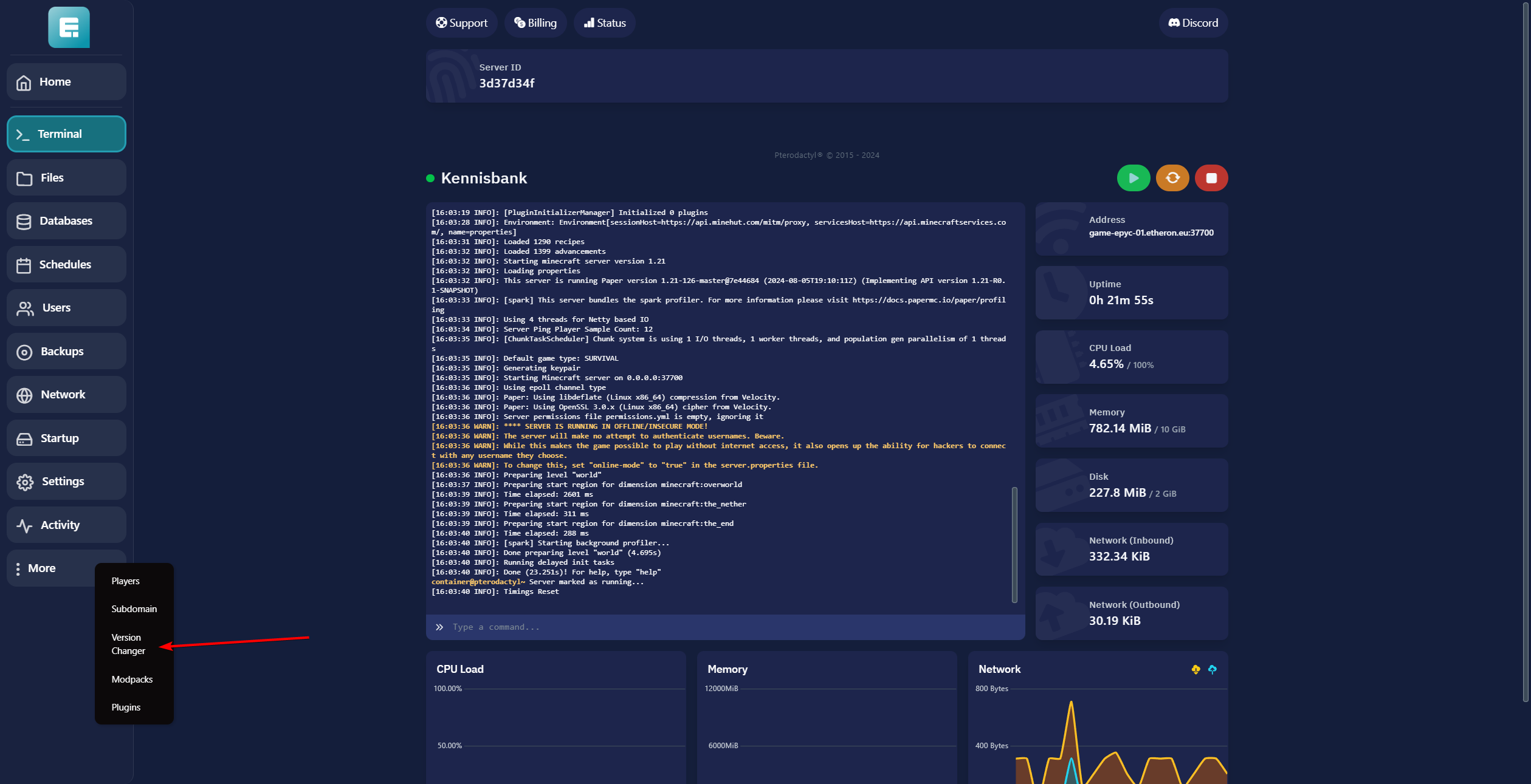 - Ga nu naar de andere Minecraft server waar je velocity mee wilt verbinden. Zet deze uit en installeer hier Paper op. Ga weer naar More > Version Changer.
