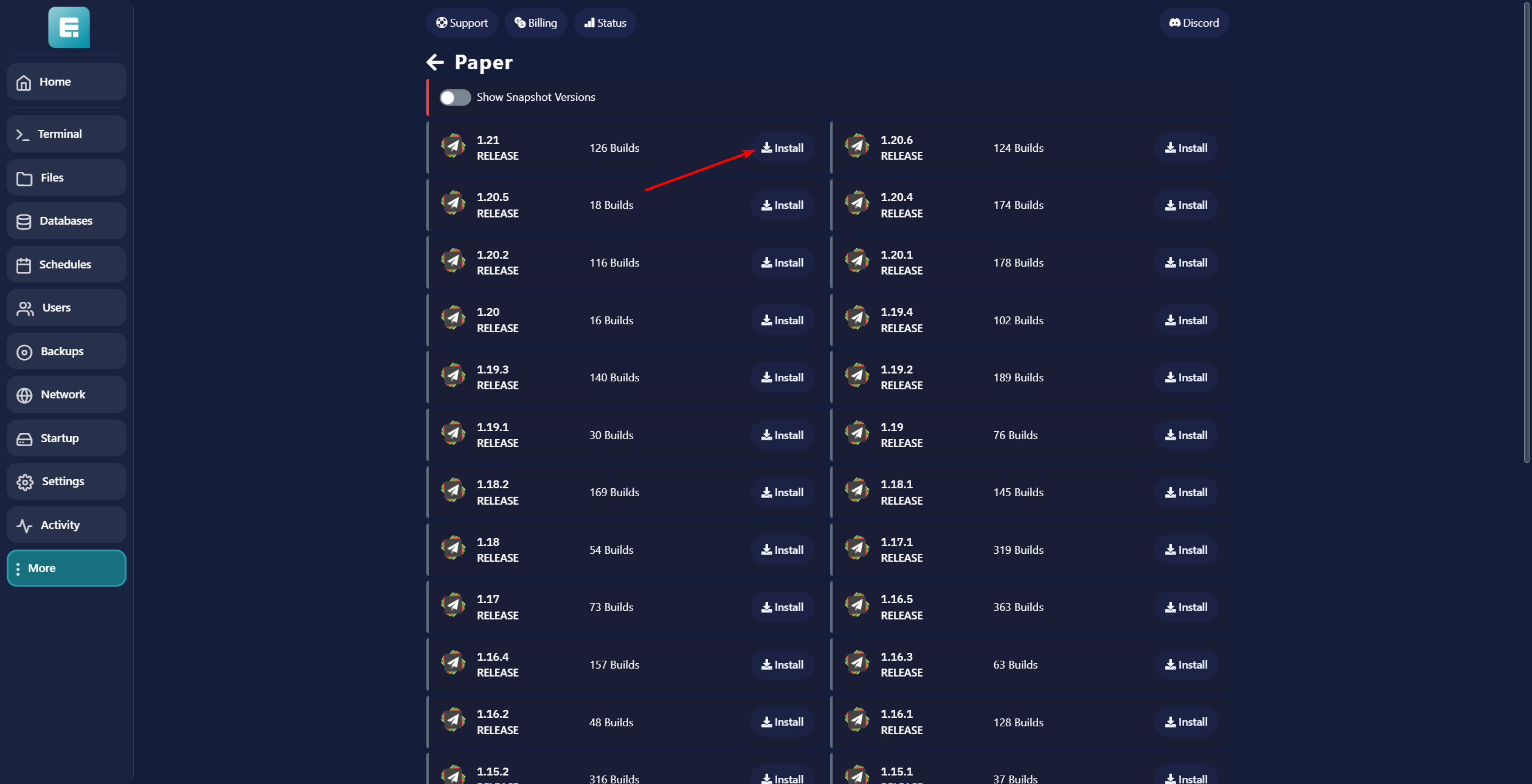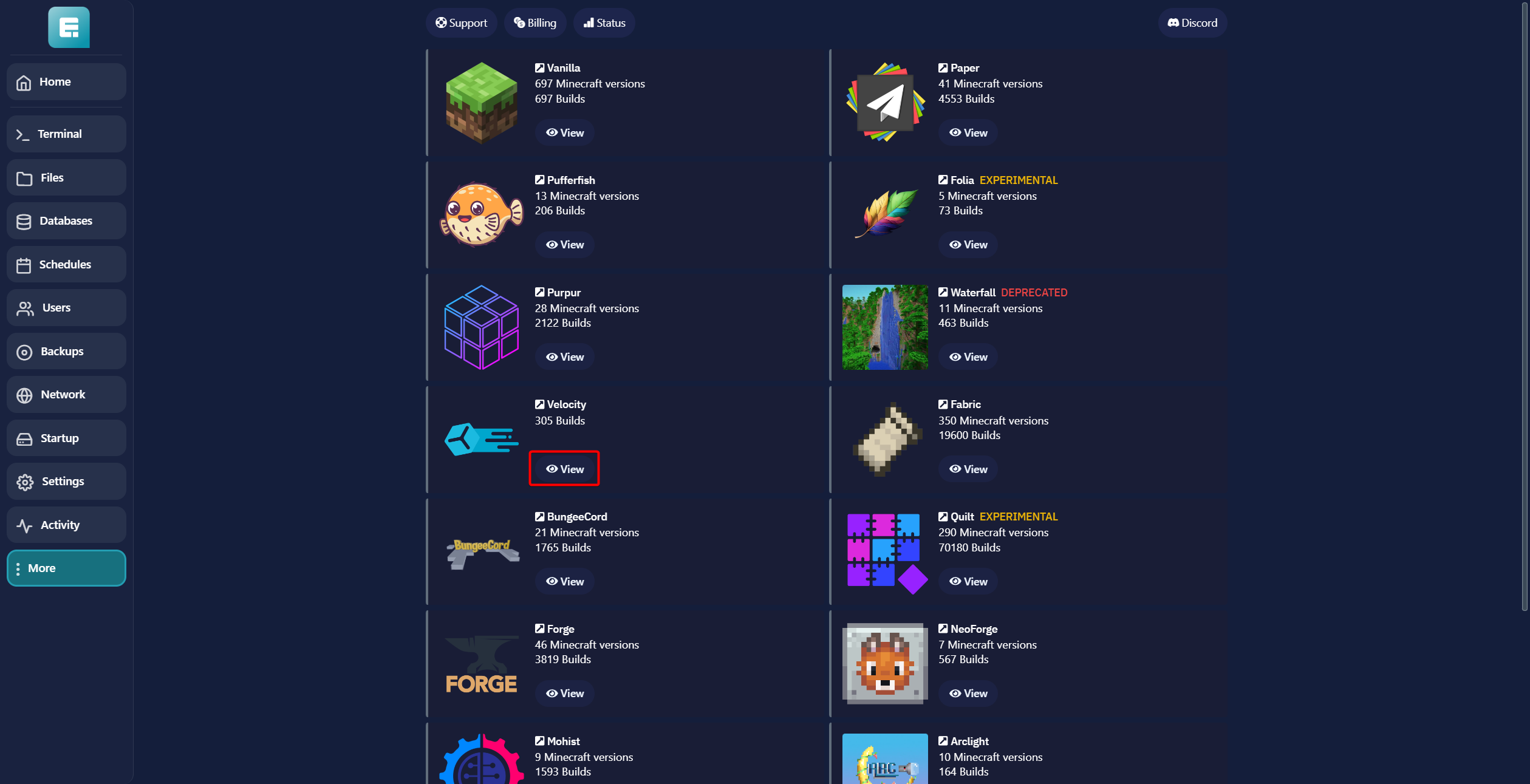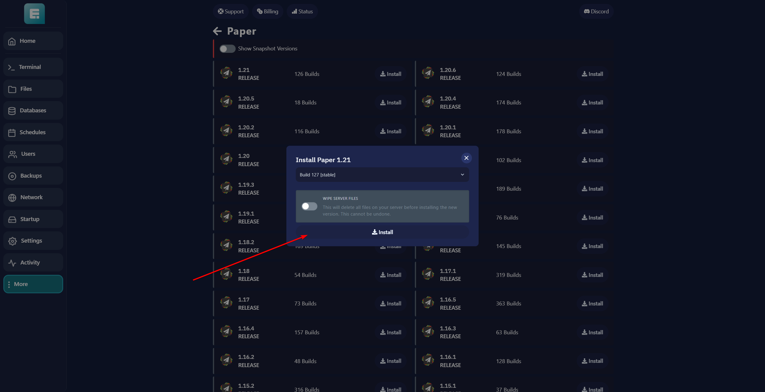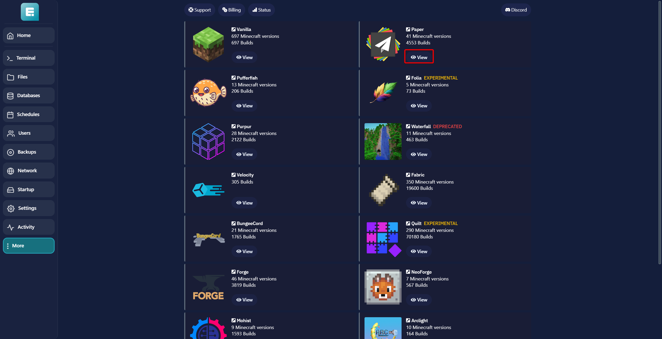 - Ga nu naar de andere Minecraft server waar je velocity mee wilt verbinden. Zet deze uit en installeer hier Paper op. Ga weer naar More > Version Changer.