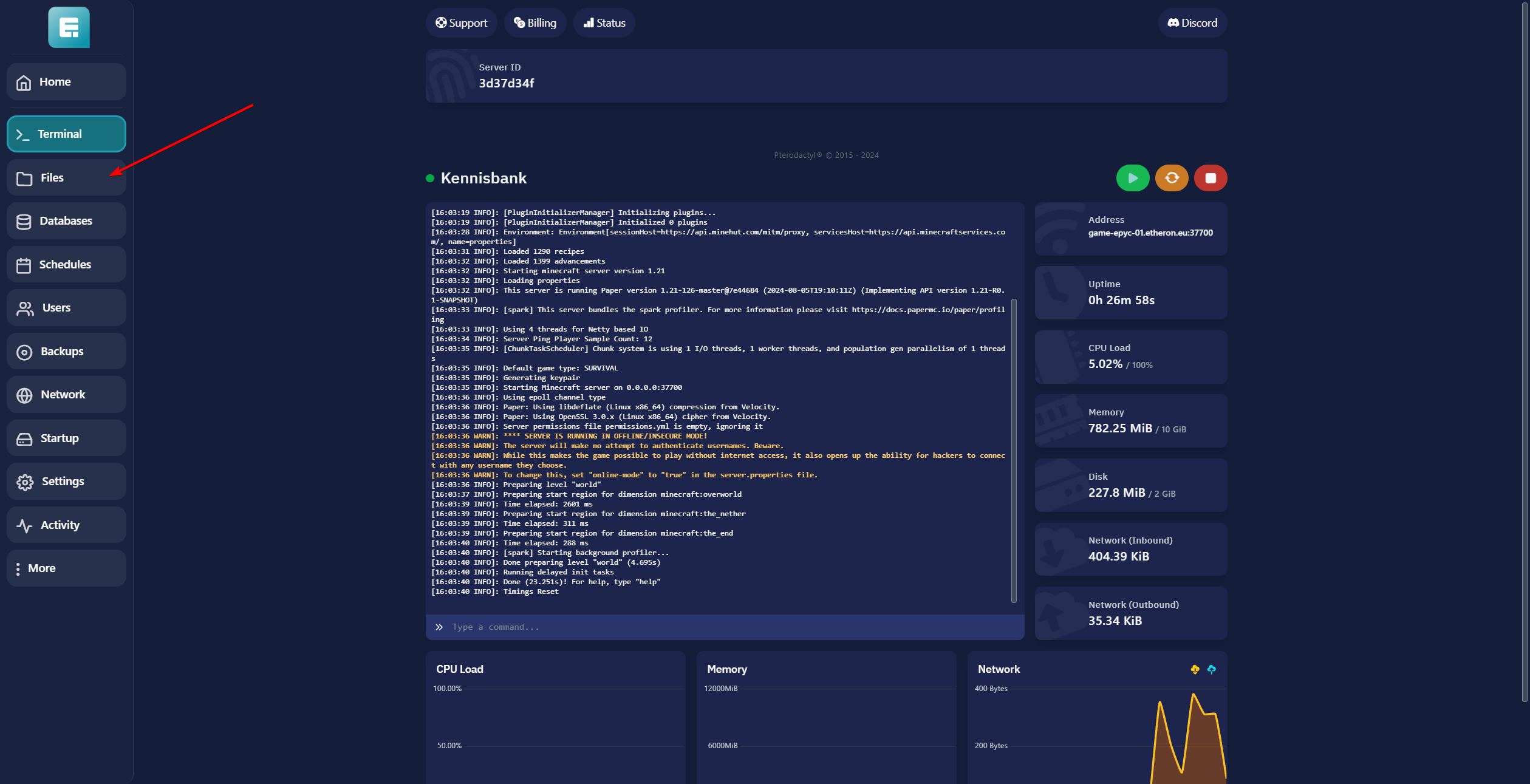 - Zodra de server klaar is met laden, zet je hem weer uit en ga naar Files links in het scherm.