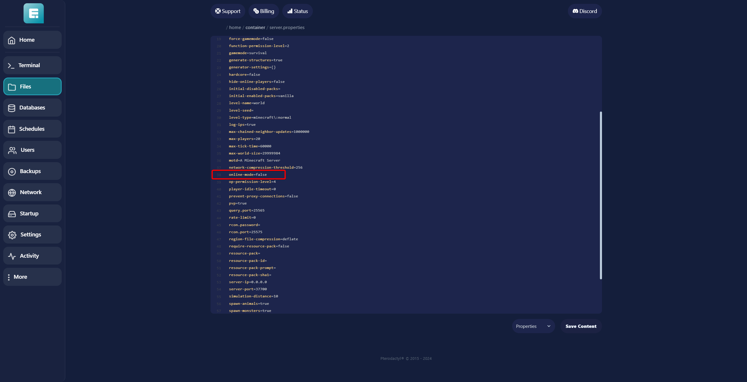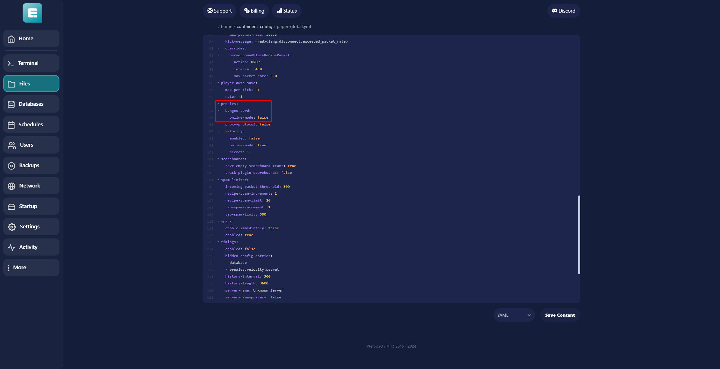 - Scroll vervolgens naar beneden tot **proxy **en zet bungee-cord: online-mode naar : false.