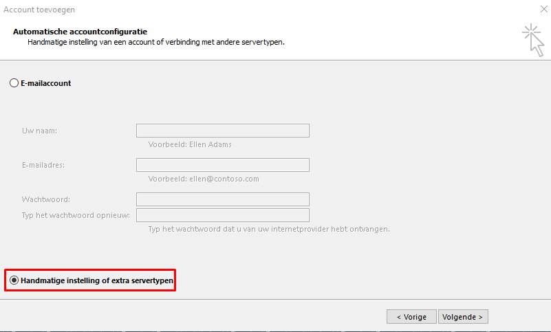 Vink hier de onderste optie aan (Handmatige instelling of extra servertypen) en klik op volgende