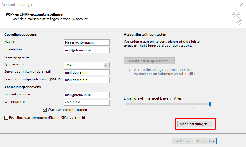 - Verander *POP3 *naar *IMAP *en klik daarna op Meer instellingen ...