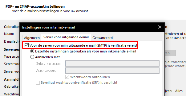 - Klik bij Meer instellingen op het tabje **Server voor uitgaande e-mail **en vink daar de bovenste optie aan: "Voor de server mijn uitgaande e-mail (SMTP) is verificatie vereist".