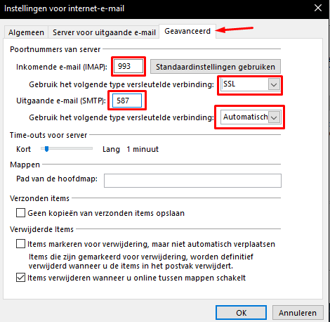 Wijzig het poortnummer voor Inkomende e-mail (IMAP) naar **993 **en kies daar **SSL **als type versleutelde verbinding.