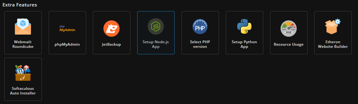 Ga naar de sectie Extra Features en klik op Setup Node.js App.