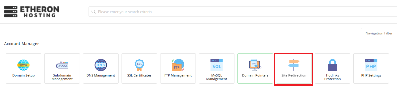 - Ga naar je Direct Admin omgeving en klik op "Site Redirection".