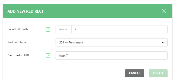 - Kies of je het domein zelf wil redirecten of een bepaalde bestands locatie, vervolgens voer je de bestemming in en klik je op "Create".