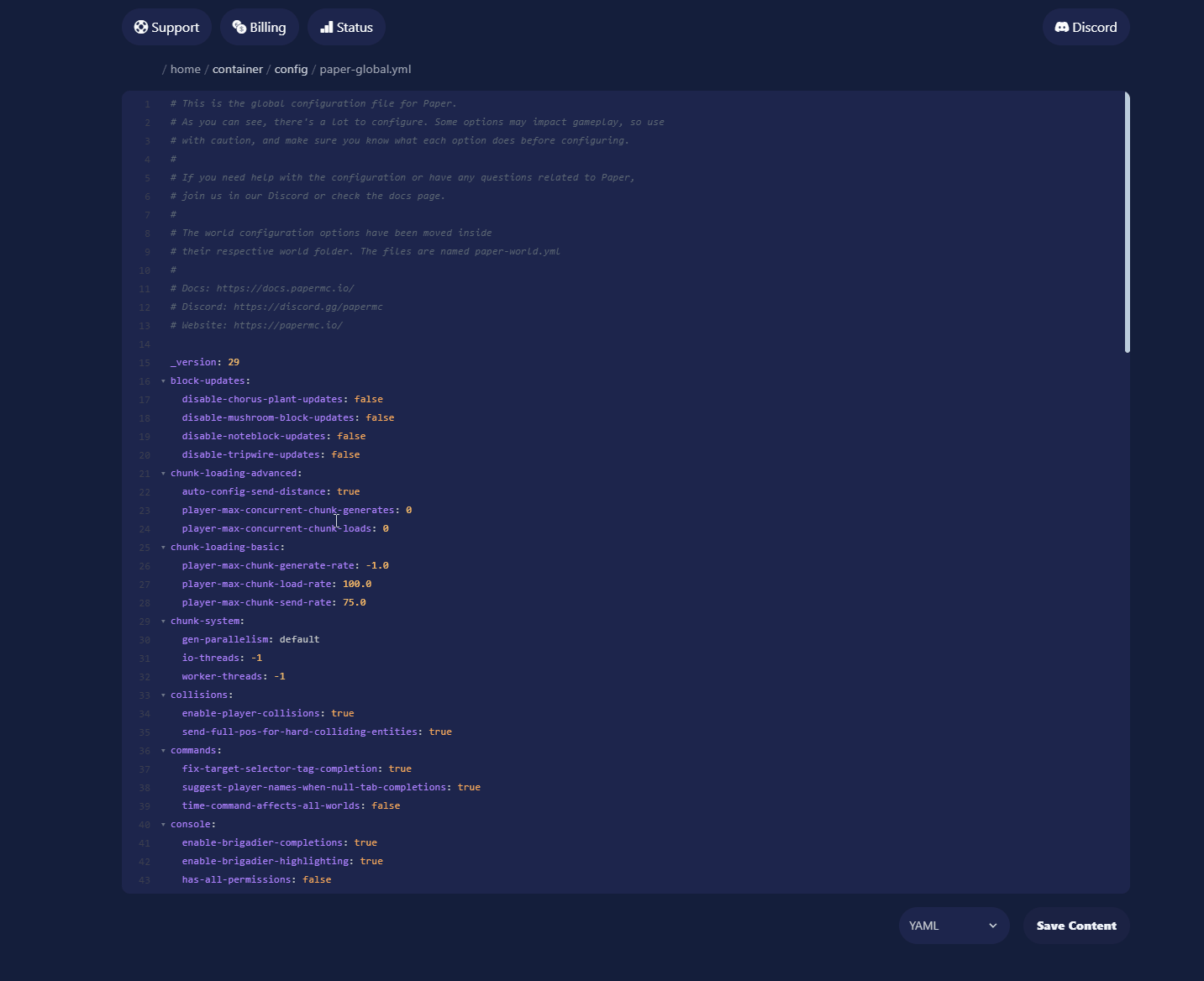 1. Open de folder config en open het bestand paper-global.yml