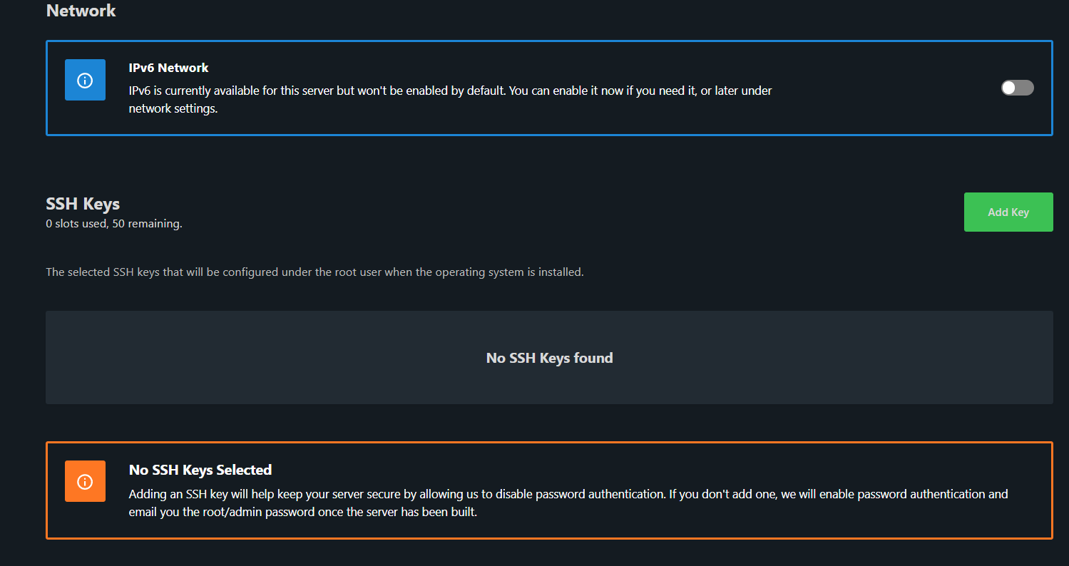 Kies of je een SSH key wilt gebruiken, in dit geval gebruiken wij de normale wachtwoord verificatie en gebruiken we dus geen SSH key.