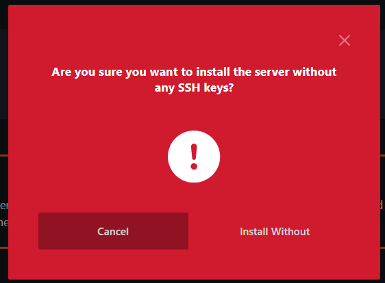 Omdat wij geen SSH key gebruiken bij deze installatie zullen we de volgende melding krijgen: ( Hier druk je op "Install without" )