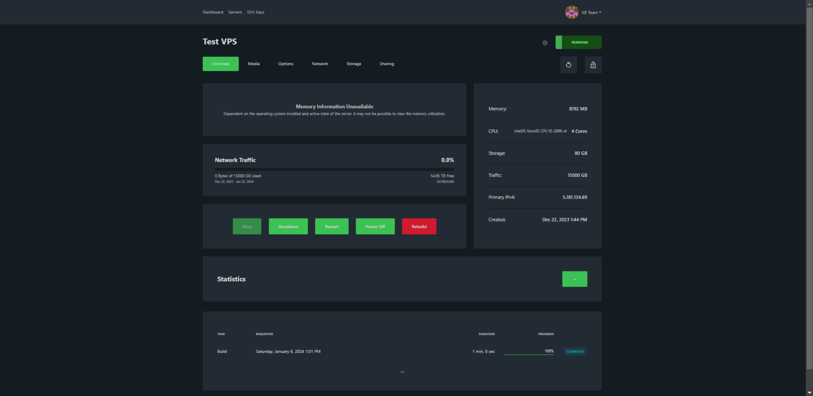Wanneer je alles goed hebt gedaan zul je zien dat de VPS nu klaar is voor gebruik!Houd er rekening mee dat de VPS bij Ubuntu niet direct toegankelijk is. dit duurt enkele minuten!